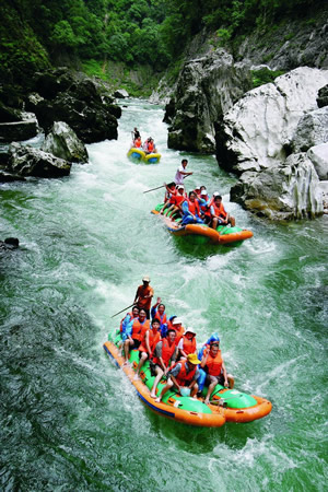 猛洞河水量豐富,河流坡降大,水急灘多浪奇,高大的峭壁直插水面,兩岸并相靠攏,形成幽深的峽谷景觀。沿河兩岸古木蒼天,蒼翠欲滴,奇石錯(cuò)落,流泉飛瀑隨處可見,下游一路水碧山青,風(fēng)光秀麗,野猴成群,溶洞奇特。猛洞河天下第一漂項(xiàng)目位于猛洞河支流,全長47公里,最精彩處位于哈妮宮至牛路河段,長約17公里。該景區(qū)兩岸多為原始次森林,蔥蔥郁郁,水流湍急,碧綠清亮,有十里絕壁,十里瀑泉,十里畫卷,十里洞天的美譽(yù)。其中有急流險(xiǎn)灘108處,大小瀑布20處。漂流,穿急流,越險(xiǎn)灘,闖狹谷,捕激浪,有驚無險(xiǎn),回味無窮。特別是哈妮宮、三角巖、雞籠門、遇仙峽(捏土)、閻王灘、落水坑、夢(mèng)思峽、鯉魚剖肚、三大炮等景點(diǎn),無不令人叫絕觀止。