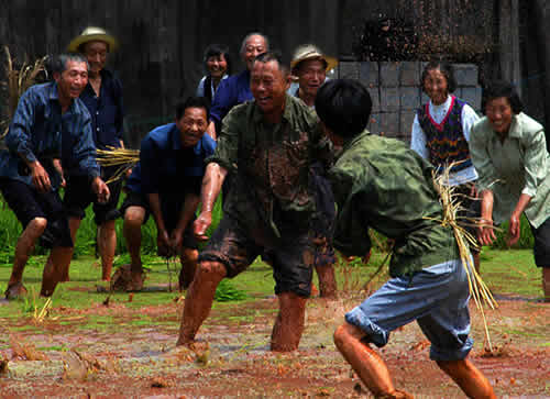 插秧活動(dòng)的最后一天,叫做“關(guān)秧門”。一丘田里,聚集了很多幫忙插秧的人,大家心里都憋著一股勁,看誰(shuí)秧插得最快。速度慢人往往會(huì)被插得快的人圍住,最后關(guān)在秧田中間出不來(lái),這叫“關(guān)豬籠”。這時(shí)候,速度快的人就會(huì)走上田埂,抓起稀泥團(tuán)朝被關(guān)了豬籠的人扔去,也有專門砸主人一身稀泥的,岸上也有人澆水。主人身上被砸的稀泥越多,主人越高興。在關(guān)秧門的最后時(shí)刻,人們會(huì)在田野里上演一場(chǎng)你追我趕的游戲,土家人把它叫做“糊倉(cāng)”。在“糊倉(cāng)”的過(guò)程中,誰(shuí)也不會(huì)記仇,大家你追我趕,場(chǎng)面極其熱鬧。