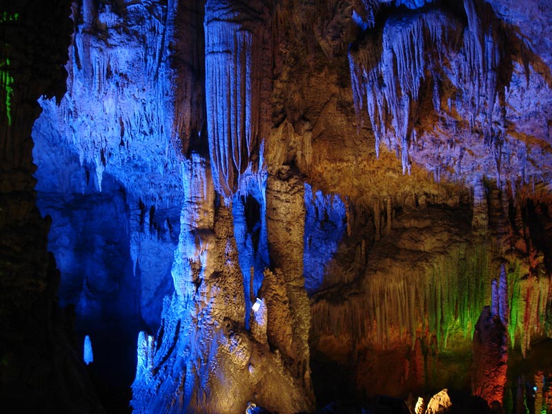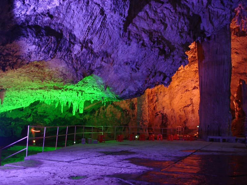 九天洞圖片 九天洞四絕: 第一絕:九天洞大 九天洞總面積250多萬平方米,折合4萬多畝。這樣一個大溶洞,比堪稱世界第一洞的利川溶洞還大3倍。據(jù)《環(huán)球天然奇觀》一書介紹,南斯拉夫的波斯托伊納大巖洞與美國的巴哈馬大藍(lán)洞,都稱為“世界上最大的洞”,還有古巴的貝拉雅馬爾大巖洞與我國貴州、湖北神農(nóng)架一些溶洞,也都被稱為“世界或中國最大的溶洞”?墒沁@些溶洞,同九天洞比較,都會感到遜色不少。1988年,中國科學(xué)地質(zhì)研究所巖溶與地下水研究室主任張壽越教授兩次來九天洞考察,他認(rèn)為該洞是亞洲第一大洞,于是他給九天洞題詞:“滴石鑄玄女,暗河鏤九天”。1988年9月下旬,來自美國、英國與比利時的15位洞穴專家對九天洞作深入研究,連續(xù)7天7夜住在洞內(nèi)全面考察。通過考察,他們一致認(rèn)為九天洞是世界奇跡,不僅具有很高的旅游價值,同時還有很高的科研價值。