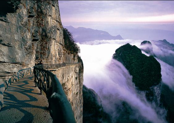 天門山鬼谷棧道圖片 棧道全長1600米,平均海拔為1400米,起點是倚虹關,終點到小天門。與其他棧道不同的是,鬼谷棧道全線既不在懸崖之巔,也不在懸崖之側(cè),而是全線都立于萬丈懸崖的中間,給人以與懸崖共起伏同屈伸的感覺。