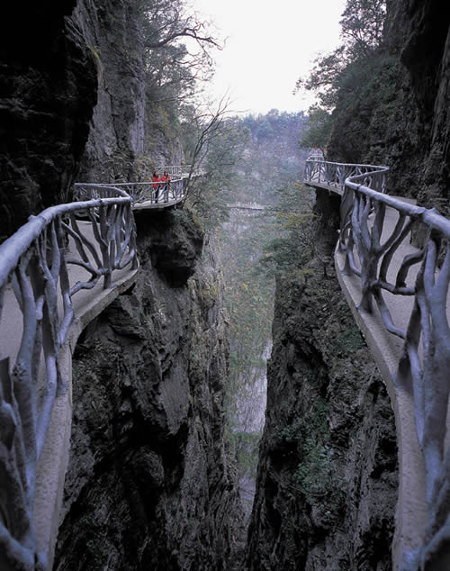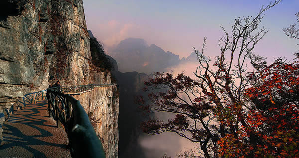 鬼谷棧道的秋天 據(jù)施工人員介紹,此條棧道也是他們所修棧道中施工最難,最險峻的一條。如果您還覺得不夠刺激的話,在棧道的完結(jié)處的兩個懸崖之間有一條長160米的懸索吊橋,同時,在海拔最高點還有一個挑戰(zhàn)心里極限的玻璃站臺,在這里,如果你能挺直腰板伸開雙臂,那么,您就是真正的勇士了。