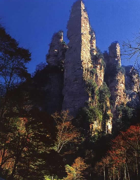 | 金鞭巖:過“閨門峰”沿溪而下約500米,有一座高約400米,孤標直立,雄奇挺拔的奇峰,名金鞭巖。金鞭巖是武陵源著名景點,峰體上細下粗,四棱分明。棱面布滿節(jié)理橫紋,形成鞭節(jié),渾如一根豎插大地的長鞭。每當夕陽晚照,鞭身涂金,熠熠閃光,瑰麗奪目,構(gòu)成一幅奇特壯美的“夕陽金鞭圖”。