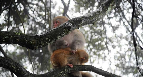 面對白雪紛飛的天氣,景區(qū)游道上原來常見的猴群突然不見了蹤影,這些可愛的獼猴去哪兒了?筆者在黃石寨景區(qū)經過一番探究發(fā)現(xiàn),獼猴去處大致有三:一是在山峰懸崖石臺處避風雪;二是在大樹樹枝上躲風雪;三是在游道旁的雜草中找溫暖。那么,這些獼猴靠什么維持生存呢?主要是靠吃樹葉,另外到訪游人攜帶的食品常常成為獼猴爭奪的“獵物”。