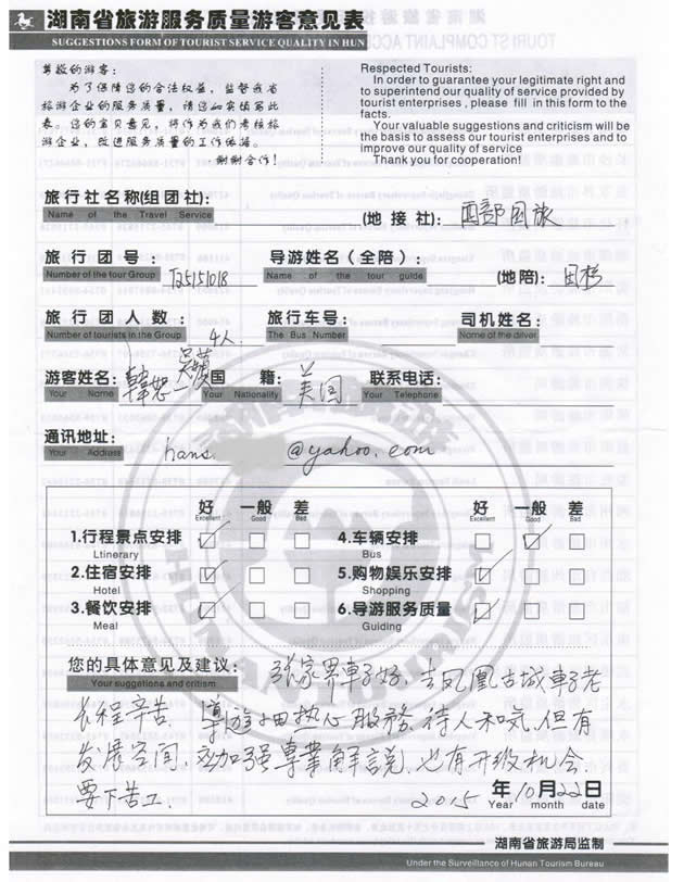 7月份,臺(tái)灣韓先生一行4位貴賓與湖南西部(張家界)中國(guó)國(guó)際旅行社工作人員——小龔取得聯(lián)系,經(jīng)過(guò)商談,雙方達(dá)成協(xié)議并簽訂旅游合同,于10月18日抵達(dá)張家界,開(kāi)始張家界之旅。此次行程是由我社優(yōu)秀導(dǎo)游——田杉負(fù)責(zé)旅游接待工作,田導(dǎo)在旅游過(guò)程中講解詳細(xì),客人也很滿意,在意見(jiàn)表上寫(xiě)道:張家界車子好,去鳳凰古城車子老長(zhǎng)程辛苦,導(dǎo)游小田熱心服務(wù),待人和氣,但有發(fā)展空間,應(yīng)加強(qiáng)專業(yè)解說(shuō),也有升級(jí)機(jī)會(huì),要下苦工。同時(shí)也感謝韓先生一行貴賓選擇湖南西部(張家界)中國(guó)國(guó)際旅行社,以及您對(duì)湖南西部國(guó)旅的信任與支持。我們會(huì)繼續(xù)努力,做好旅游接待工作。期待下一次與您的合作,祝您愉快!