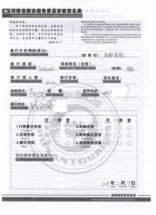 現(xiàn)在位置:首頁(yè) -> 西部國(guó)旅->旅游質(zhì)量反饋 -> 2016-2-11 青島薛璐一行5位貴賓張家界、袁家界、黃龍洞、鳳凰古城四晚四日游