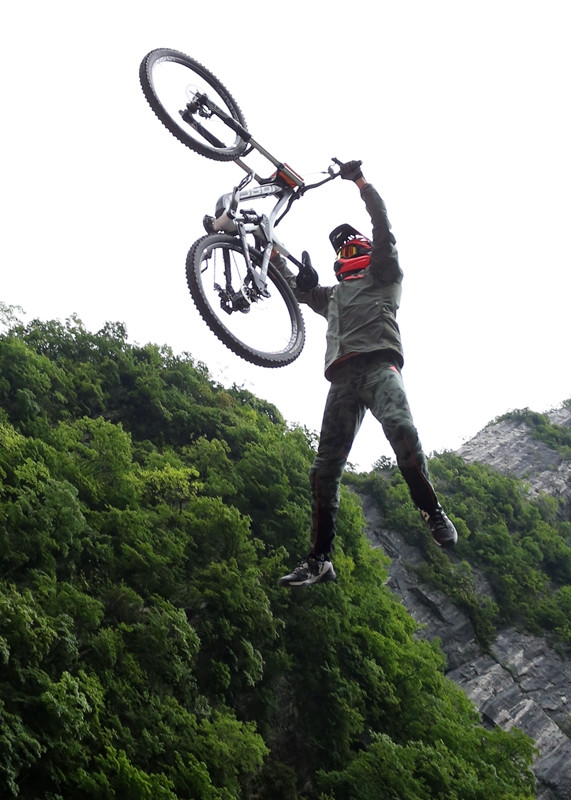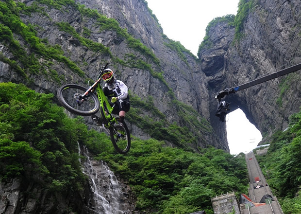 張家界天門山天門洞,999級(jí)臺(tái)階,以39°斜坡筆直往下,看一眼都覺得眩暈。如果有人騎著山地車一路沖下來,你一定會(huì)說“瘋了!”。