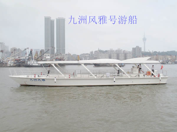 “九洲風雅”號游船:船長23.08米,寬5.03米,擁有80客位。此船造型簡約,有很強的時尚設(shè)計感,與馬爾代夫的游船同款。