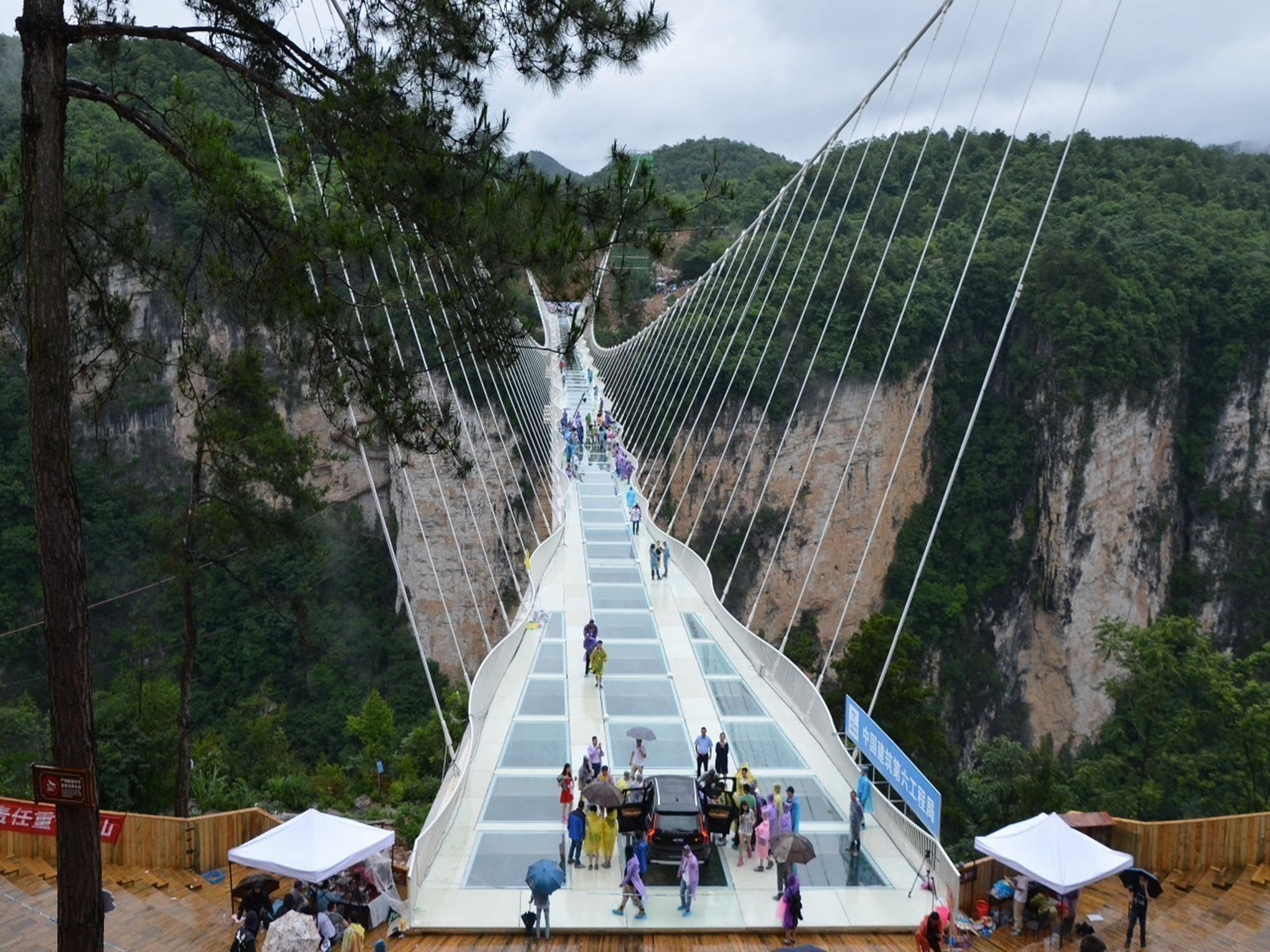 張家界大峽谷玻璃橋位于湖南省的張家界大峽谷景區(qū)栗樹(shù)埡和吳王坡區(qū)域內(nèi),為一座景觀橋梁,兼具景區(qū)行人通行、游覽、蹦極、溜索、T臺(tái)等功能。主跨430米,一跨過(guò)峽谷,橋面長(zhǎng)375米,寬6米,橋面距谷底相對(duì)高度約300米。這座全透明玻璃橋長(zhǎng)度、高度位居世界第一。
