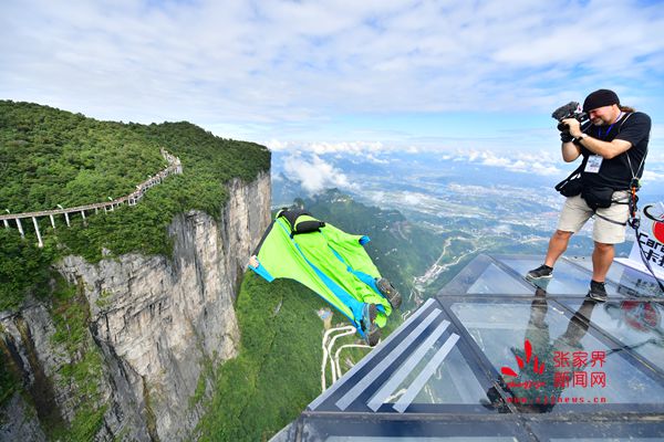 2017世界翼裝飛行世錦賽將于9月8日-10日在張家界天門山舉辦。開賽在即,9月7日上午,來自全球11個國家的16名翼裝飛行員從海撥1458米的張家界天門山玉壺峰頂一躍而下,在奇峰險(xiǎn)壑間進(jìn)行競速訓(xùn)練。